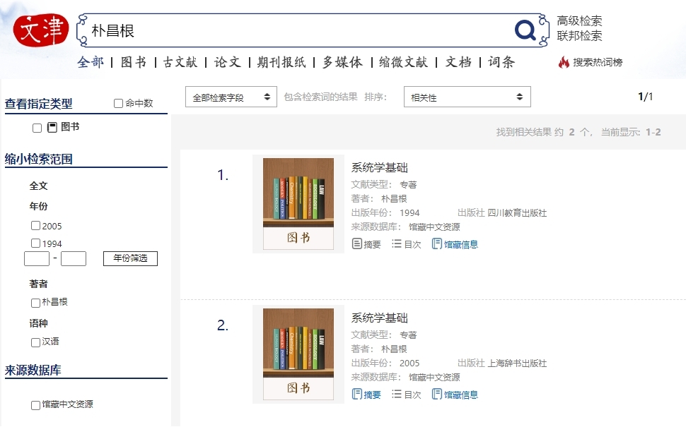 许多图书馆馆藏图书中没有《系统学基础》(朴昌根,四川教育,1994年)。所以,有人甚至怀疑该书的存在。先将能看到该书的两家图书馆与一个网站介绍如下。