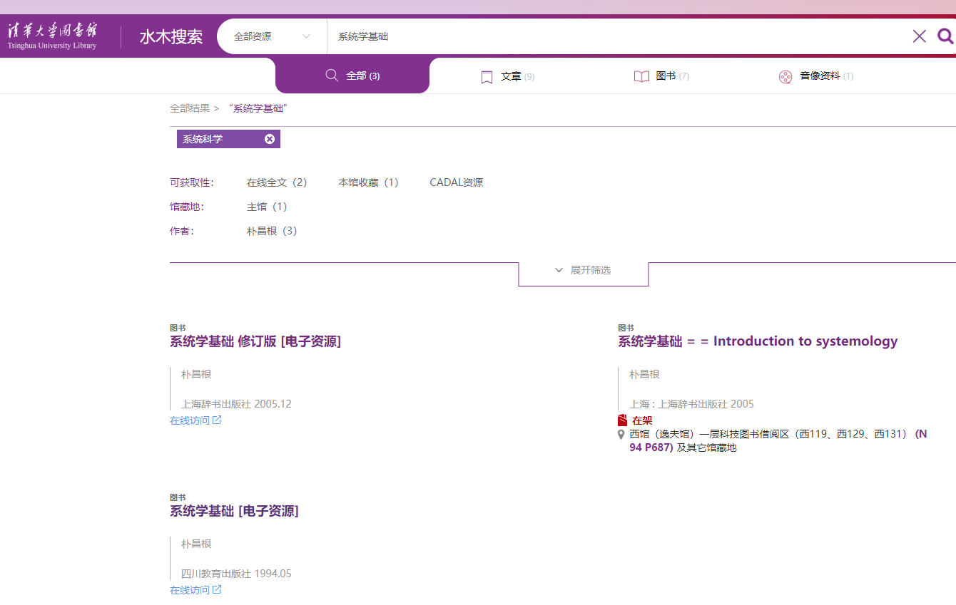 除中国国家图书馆、复旦大学图书馆、孔夫子旧书网外,人们在清华大学图书馆、北京大学图书馆也发现了《系统学基础》(朴昌根,四川教育,1994年)。不过,迄今为止,这两家图书馆里只看到电子资源。