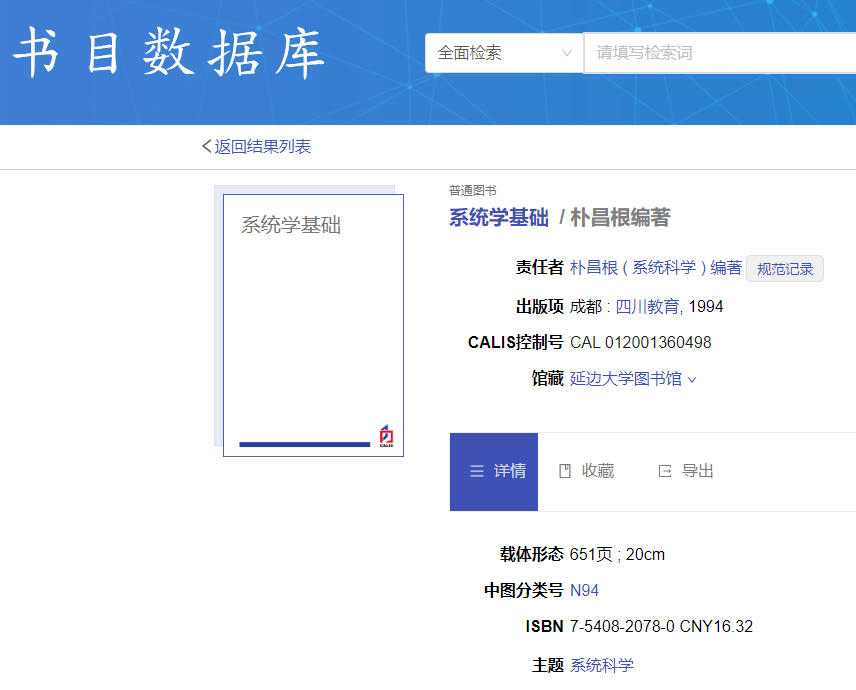 今通过CALIS(‌中国高等教育文献保障系统‌)发现延边大学图书馆也有《系统学基础》(朴昌根,四川教育,1994年)的收藏,是纸质书。